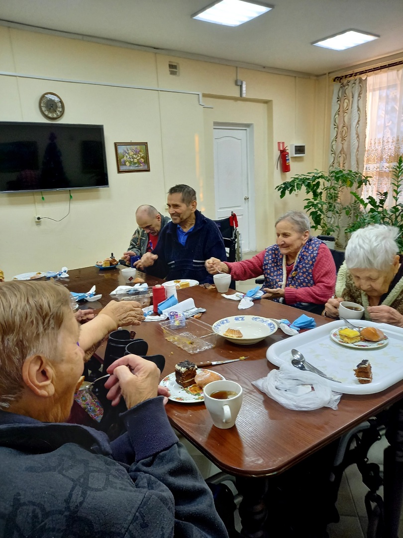 в доме - интернате прошло праздничное чаепитие .слушали и пели любимые песни, отгадывали загадки,играли в игры и конечно же пили вкусный чай с тортиком и принимали подарки!)