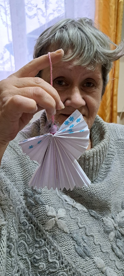 в доме - интернате прошли занятия в студии "Радость Творчества". На занятии по бумажной пластике проживающие сложили из цветной бумаги,ниточки и бусины "Ангела".