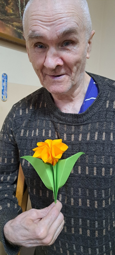 в доме - интернате прошли занятия в студии "Радость Творчества". Проживающиющие из цветной бумаги сложили "Тюльпан" Бумажная пластика.