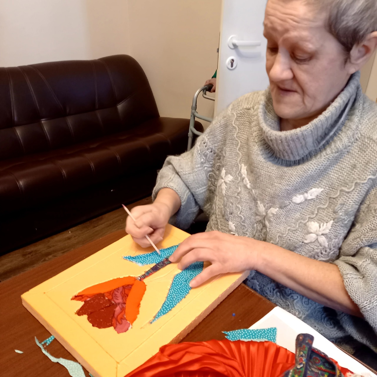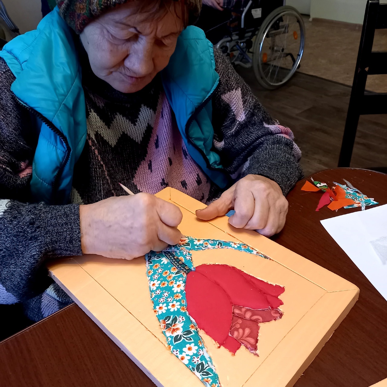 в доме - интернате прошли занятия в студии "Радость Творчества". Проживающие продолжили знакомство с интересной техникой "Печворк без иглы кинусайга " композиция "Птичка".
